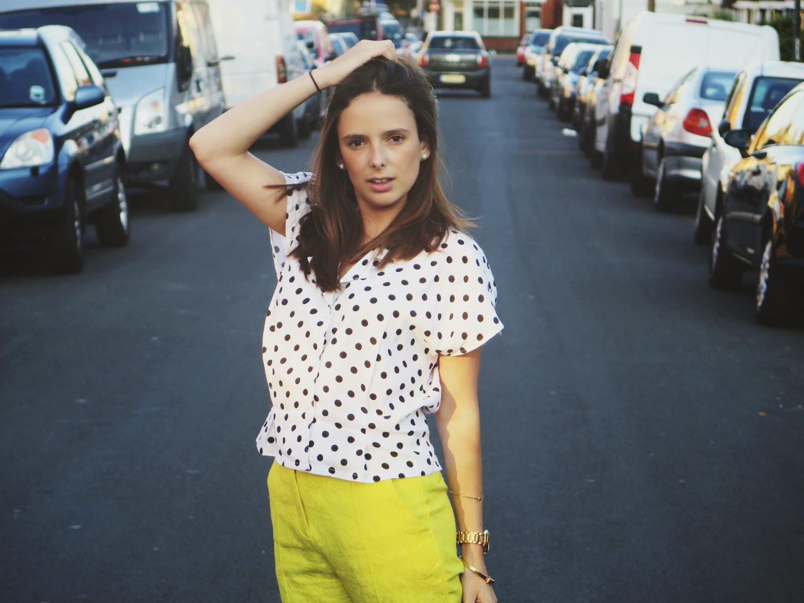 Leather Jacket: Topshop | Shirt: Vintage @ Brick Lane | Lemon Trousers: Zara (old) | Slides: Topshop | Bow Bracelet: Kate Spade NY | Arrow Bracelet: Stella Dot | Watch: Swatch